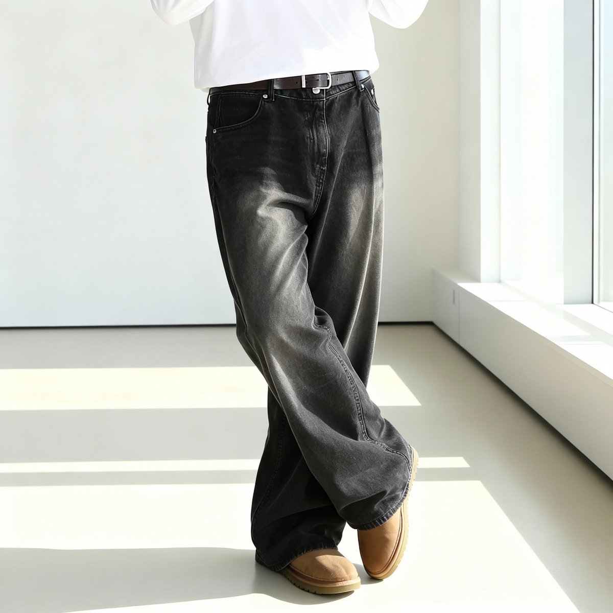 Rehaussez votre garde-robe avec notre jean ample noir délavé, la quintessence de l'élégance moderne et de la polyvalence de la mode masculine coréenne.